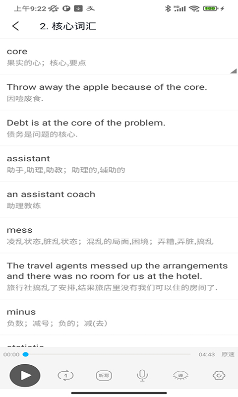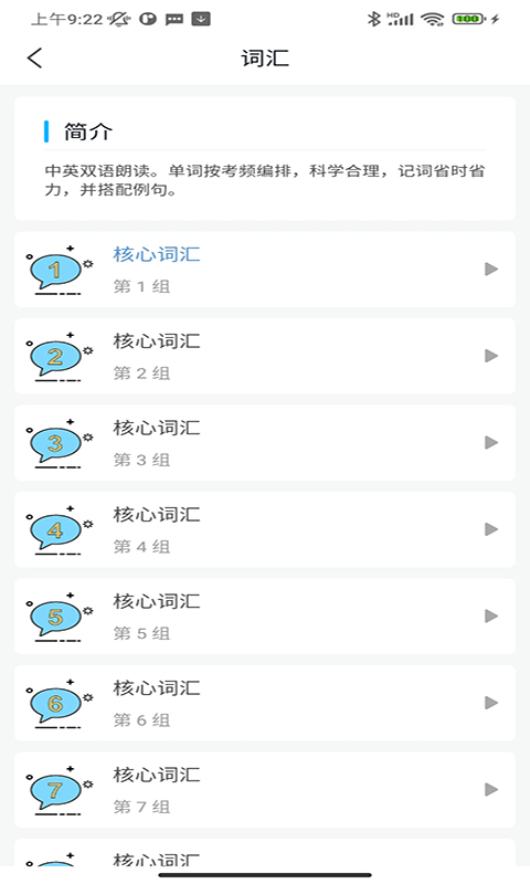 1.词汇。英语四级核心词汇的中英双语朗读。词汇按考频编排,科学合理,记词省时省力,并搭配例句。词汇可以跟读,可以点读,重点词汇还可以查看详细解析。